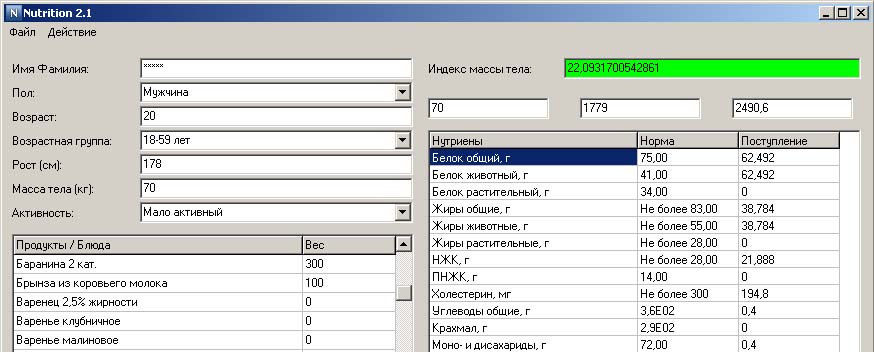 Вот небольшой пример, который может показать какое у нас расхождение с нормами для конкретного человека с определенным меню: